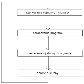 Spracovanie programu – sériové vykonávanie príkazov a zápis nových hodnôt do pamäte výstupov