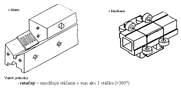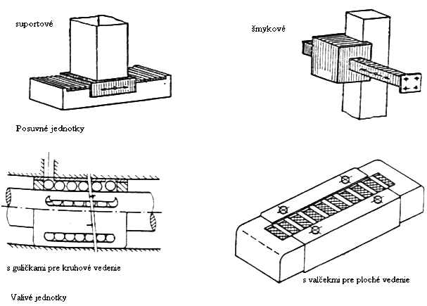 - priamočiary – posuvné jednotky: suportové, šmykové, teleskopické (pre minimálne trenie: valivé uloženie – gulôčky, valčeky, ihly, kladky)