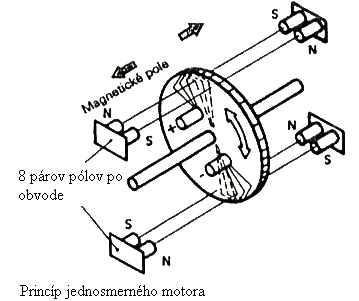- ak prechádza vinutím rotora prúd, pôsobí magnetické pole permanentného magnetu statora na rotor točivým momentom.