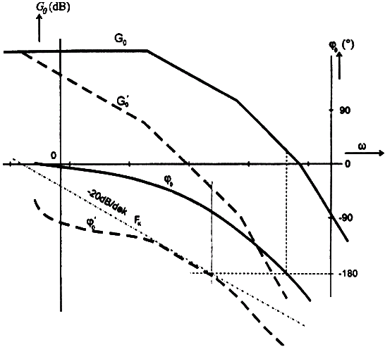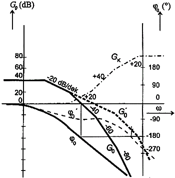 – čiarkovaná čiara → stabilný regulačný obvod s prenosom G´0 a fázou φ´0