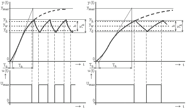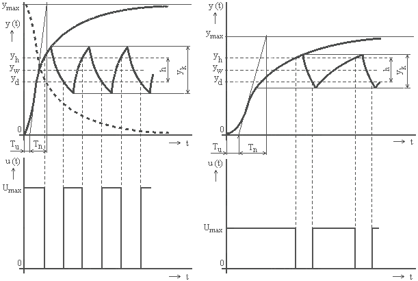 Zmenšením hysterézy h je možné dosiahnuť vyššiu kvalitu regulácie – zmenší sa totiž rozkmit regulovanej veličiny, viď obr.5.23. Dôsledkom je ale i zvýšenie frekvencie spínania akčnej veličiny, čo môže viesť k problému so spoľahlivosťou spínacieho prvku a zvýšenou hladinou rušenia. Vyššiu kvalitu regulácie dosiahneme i zmenšením doby prieťahu a nábehu regulovanej sústavy, čo je viditeľné z obr. 5.24. a 5.25. To však predpokladá možnosť zmeny parametru sústavy a nie je to vždy z technických dôvodov možné.