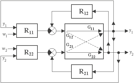 Má viac regulovaných (meraných) i viac akčných veličín a vtedy i regulačných orgánov. V týchto prípadoch vznikajú krížové prenosy, ktoré veľmi komplikujú chovanie systému (obr. 5.32.). Dvojparametrovou sústavou je napr. sprchová batéria riadená pomocou dvoch ventilov. Každý z ventilov ovláda množstvo teplej, či studenej vody a tak napr. pri požadovanej zmene teploty sa zmení i množstvo, ktoré sa ručne obtiažne doregulováva na pôvodnú hodnotu. Podobné je to i u ďalších sústav, ako napr. dávkovanie chlóru do vody (kyslosť množstvo atď.). Pomocou správne navrhnutej viac parametrovej regulácie je možné dosiahnuť tzv. autonómnosť obvodu, t.j. že zmena každej z riadiacich veličín sa prejaví iba na zodpovedajúcu regulovanú veličinu.