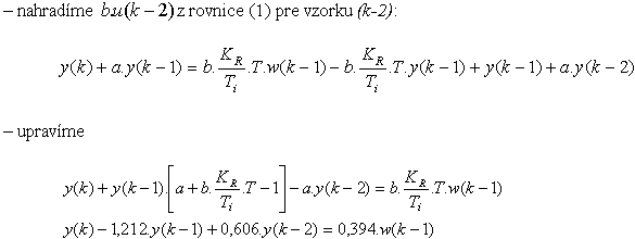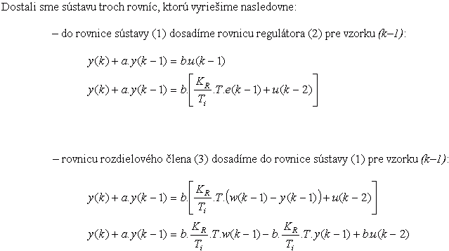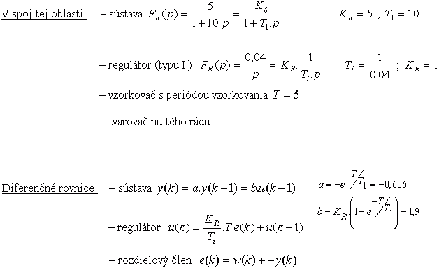 Príklad1: Určite diferenčnú rovnicu regulátora, regulovanej sústavy a diferenčnú rovnicu určujúcu závislosť regulovanej veličiny y(k) od riadiacej veličiny w(k).