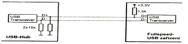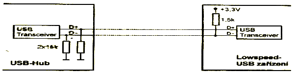 Hub má dva vnútorné odpory 15kΩ a v nepoužitom prípoji je neaktívny, t.j. obe signálové linky (D+, D-) sú na úrovni LOW.