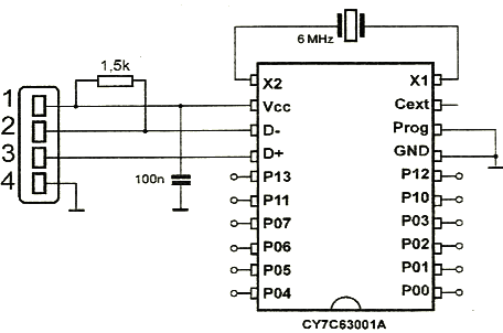 - príklad zapojenia: kontrolér CY7C63001A (na porty P1, P0 sú už potom pripojené
