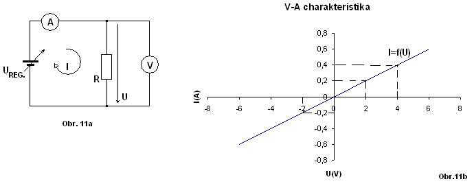 Ak zapojíme pasívnu jednobránu podľa schémy na obr. 11a, každej hodnote napätia U môžeme určiť zodpovedajúcu hodnotu prúdu I. Ako sme uviedli v stati 1.3.1. získaná závislosť je voltampérová charakteristika jednobrány, ktorá môže mať pre rôzne súčiastky iný priebeh. Ak je grafom priamka (obr. 11b)