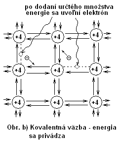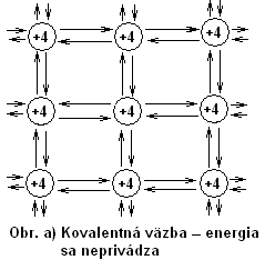Valenčná sféra je veľmi pevná, pretože s okolitými atómami je doplnená na nasýtenú kovalentnú väzbu. Z toho vyplýva, že všetky valenčné é sa v týchto väzbách využijú a nezostáva už žiaden é na vedenie elektrického prúdu. Hovoríme, že pri takýchto podmienkach je nulová vodivosť polovodiča - viď obr. a