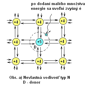 Ak v kryštálovej mriežke štvormocného prvku (Ge alebo Si), nahradíme niektoré atómy atómami päťmocného prvku (P - fosfor, As - astát, Sb - antimón), využijú sa iba 4 z 5 valenčných é prímesi. Piaty é sa nezúčastňuje väzby, je voľne viazaný k jadru. Na jeho uvoľnenie stačí energia rádovo stotiny eV, napr.: teplota okolia, rôzne druhy žiarenia,... Uvoľnené é päťmocných prímesi, tzv. darcovia alebo donory sa pohybujú v priestore kryštálovej mriežky. Vytvárajú vodivosť vyvolanú pohybom záporných, negatívnych nábojov, ktorá sa nazýva nevlastná vodivosť typu N aj é vodivosť - viď obr. a)