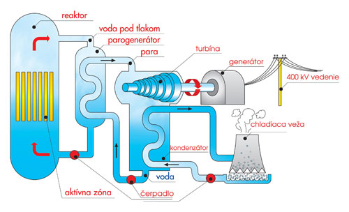 Palivo v podobe palivových kaziet je umiestnené v tlakovej nádobe reaktora, do ktorej prúdi chemicky upravená voda. Táto preteká kanálikmi v palivových kazetách a odvádza teplo, ktoré vzniká pri štiepnej reakcii. Voda z reaktora vystupuje s teplotou asi 297°C a prechádza horúcou vetvou primárneho potrubia do tepelného výmenníka - parogenerátora. V parogenerátore preteká zväzkom trubiek a odovzdáva teplo vode, ktorá je privádzaná zo sekundárneho okruhu s teplotou 222°C. Ochladená voda primárneho okruhu sa vracia späť do aktívnej zóny reaktora. Voda sekundárneho okruhu sa v parogenerátore odparuje a cez parný kolektor sa para odvádza na lopatky turbíny. Hriadeľ turbíny roztáča generátor, ktorý vyrába elektrickú energiu.
