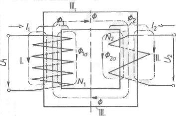 Základnou časťou každého transformátora je magnetický obvod, ktorý je zložený z elektrotechnických plechov hrúbky 0,35 alebo 0,5mm. Na železnom jadre sú navinuté dve cievky a to primárna (vstupná) I a sekundárna (výstupná) II . Vinutia sú ukončené na veku transformátorovej nádoby.