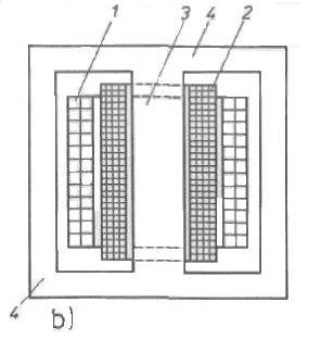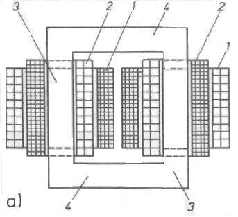 | 1 - cievky nn (II), 2 - cievky vn (I), 3 - jadro transformátora, 4 - magnetická spojka |