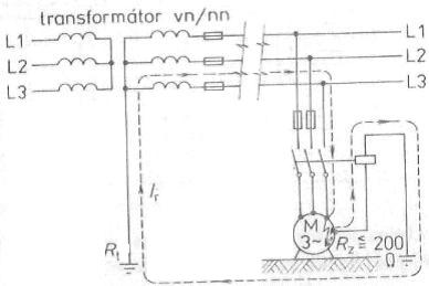 Ochrana zemnením: Podstatou tejto ochrany je spojenie neživej časti so zemou. Pri poruche sa chybné zariadenie odpojí pôsobením poruchového prúdu, ktorý sa uzatvára zemou cez uzol transformátora. Ochrana uzemnením je veľmi spoľahlivá, prakticky sa však dá realizovať len do 35 A vypínacieho prúdu poistky. Pri väčších prúdoch je už veľmi ťažko zabezpečiť potrebný ochranný zemný odpor. Preto sa táto ochrana pri väčších prúdoch dopĺňa napäťovými a prúdovými chráničmi.