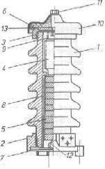 1 – Izolátor, 2 - spodná uzatváracia príruba, 3 - vrchný uzáver, 4 iskrište, 5 - napäťovo závis|ý odporový stĺpec, 6.7- membrány, 8 puzdro, 9 tlačná pružina, 10 - kryt, 11 – svorka, 12 - odvlhčovač, 13 – tmel
