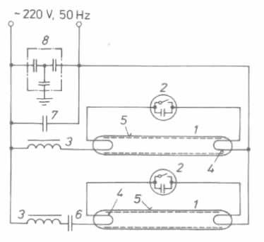 5 - luminofor,6 - kondenzátor (na posun fázy prúdu), 7 - kondenzátor (na kompenzáciu účinníka),