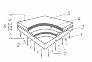 3 - luminiscenčný prášok - elektroluminofor (ZnS), 4 - reflexná vrstva, 5 - zadná kovová elektróda, 6 - zdroj elektrickej energie, 7 - emitované svetlo