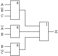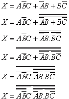 X musíme upraviť tak, aby premenné navzájom tvorili konjunkciu (súčin) a dve premenné boli navzájom viazané spoločnou negáciou: